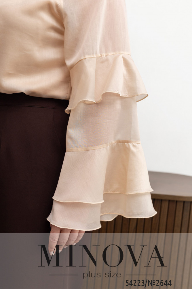Блуза, яка одразу додає образу м’якості та виразності. Модель вільного крою з легкою посадкою красиво лягає по фігурі, створюючи плавний, елегантний силует. Верх оформлений високою горловиною зі збіркою, що додає об’єму та витонченості. Позаду на шиї — зав’язки, які фіксують горловину та додають образу делікатного акценту. Рукави об’ємні, з багатоярусними воланами, які створюють ефект руху та додають образу легкості й жіночності. Підкладка забезпечує комфорт і впевненість у носінні. Блуза легко поєднується як із класичними брюками, так і з більш розслабленими речами, створюючи виразні та стильні образи.