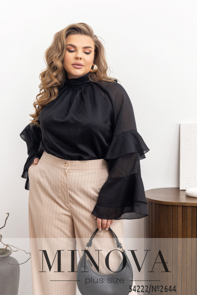 Блуза, яка одразу додає образу м’якості та виразності. Модель вільного крою з легкою посадкою красиво лягає по фігурі, створюючи плавний, елегантний силует. Верх оформлений високою горловиною зі збіркою, що додає об’єму та витонченості. Позаду на шиї — зав’язки, які фіксують горловину та додають образу делікатного акценту. Рукави об’ємні, з багатоярусними воланами, які створюють ефект руху та додають образу легкості й жіночності. Підкладка забезпечує комфорт і впевненість у носінні. Блуза легко поєднується як із класичними брюками, так і з більш розслабленими речами, створюючи виразні та стильні образи.