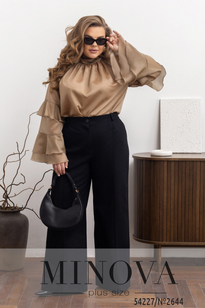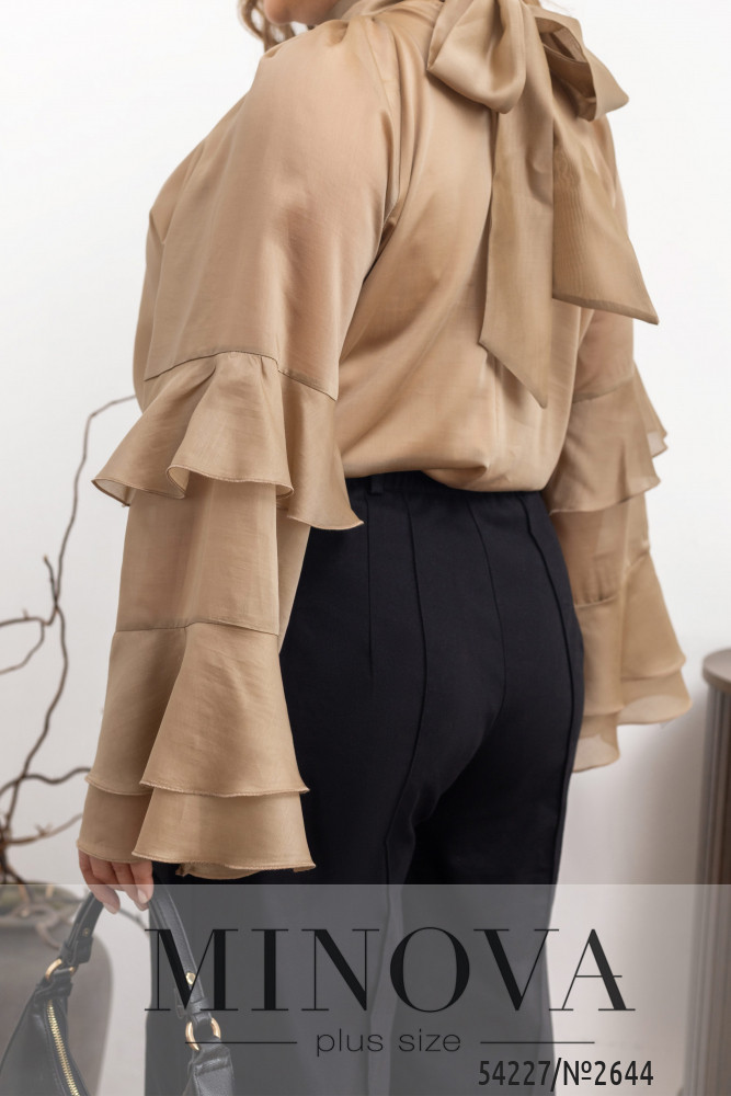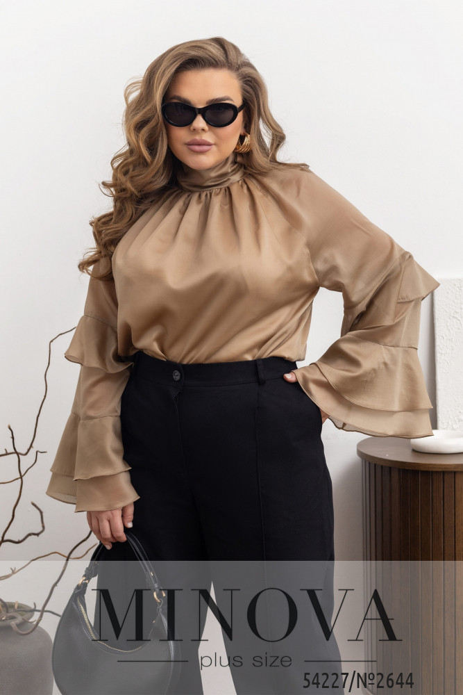 Блуза, яка одразу додає образу м’якості та виразності. Модель вільного крою з легкою посадкою красиво лягає по фігурі, створюючи плавний, елегантний силует. Верх оформлений високою горловиною зі збіркою, що додає об’єму та витонченості. Позаду на шиї — зав’язки, які фіксують горловину та додають образу делікатного акценту. Рукави об’ємні, з багатоярусними воланами, які створюють ефект руху та додають образу легкості й жіночності. Підкладка забезпечує комфорт і впевненість у носінні. Блуза легко поєднується як із класичними брюками, так і з більш розслабленими речами, створюючи виразні та стильні образи.