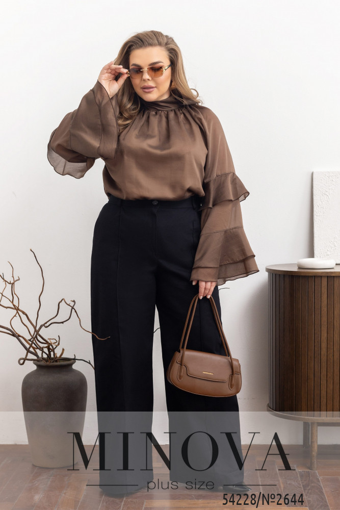 Блуза, яка одразу додає образу м’якості та виразності. Модель вільного крою з легкою посадкою красиво лягає по фігурі, створюючи плавний, елегантний силует. Верх оформлений високою горловиною зі збіркою, що додає об’єму та витонченості. Позаду на шиї — зав’язки, які фіксують горловину та додають образу делікатного акценту. Рукави об’ємні, з багатоярусними воланами, які створюють ефект руху та додають образу легкості й жіночності. Підкладка забезпечує комфорт і впевненість у носінні. Блуза легко поєднується як із класичними брюками, так і з більш розслабленими речами, створюючи виразні та стильні образи.