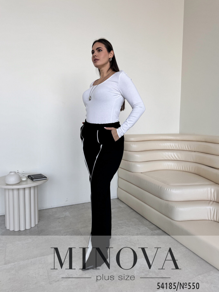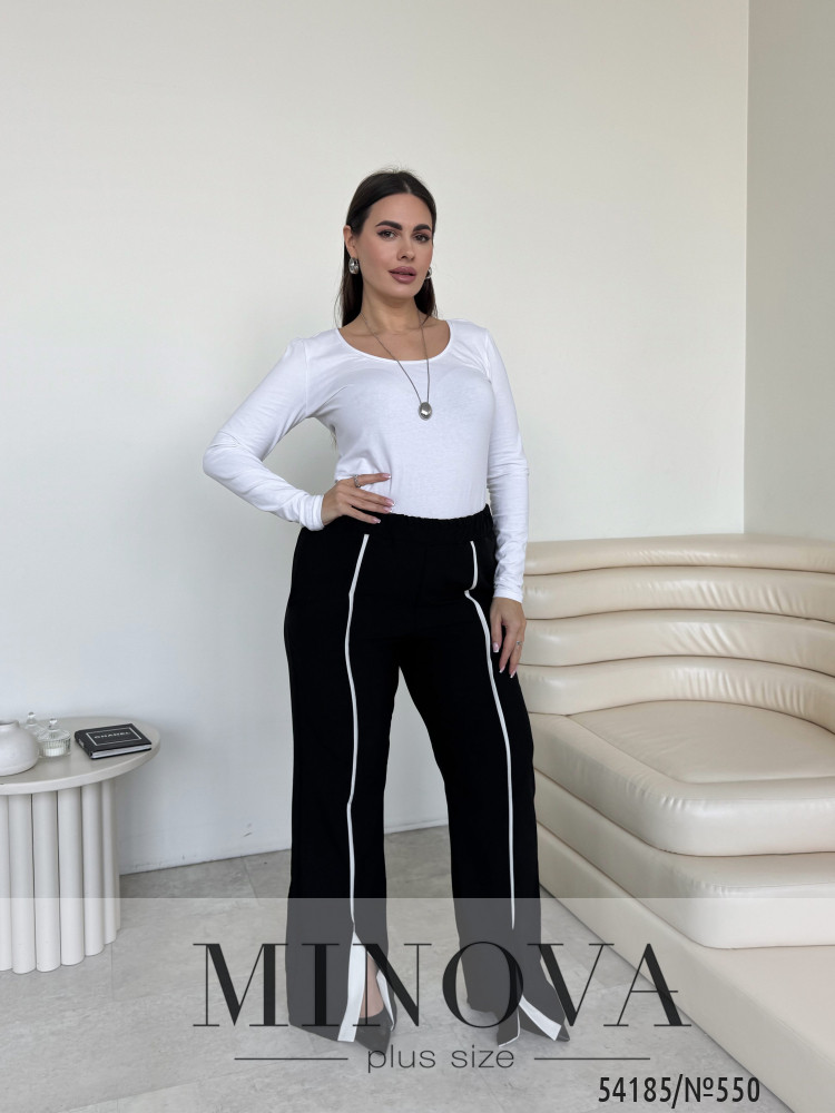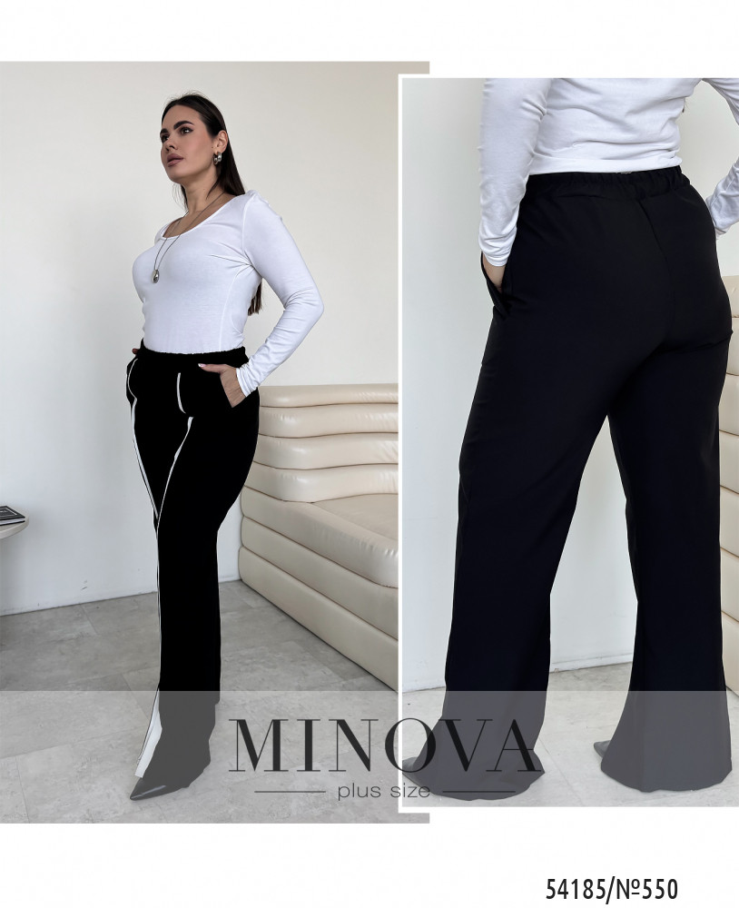 Пояс на гумці забезпечує комфортну посадку по талії без перетискання, а бічні кишені додають практичності. Особливий акцент — декоративні розрізи по низу штанин із контрастною вставкою, які красиво відкривають взуття та роблять образ більш виразним.