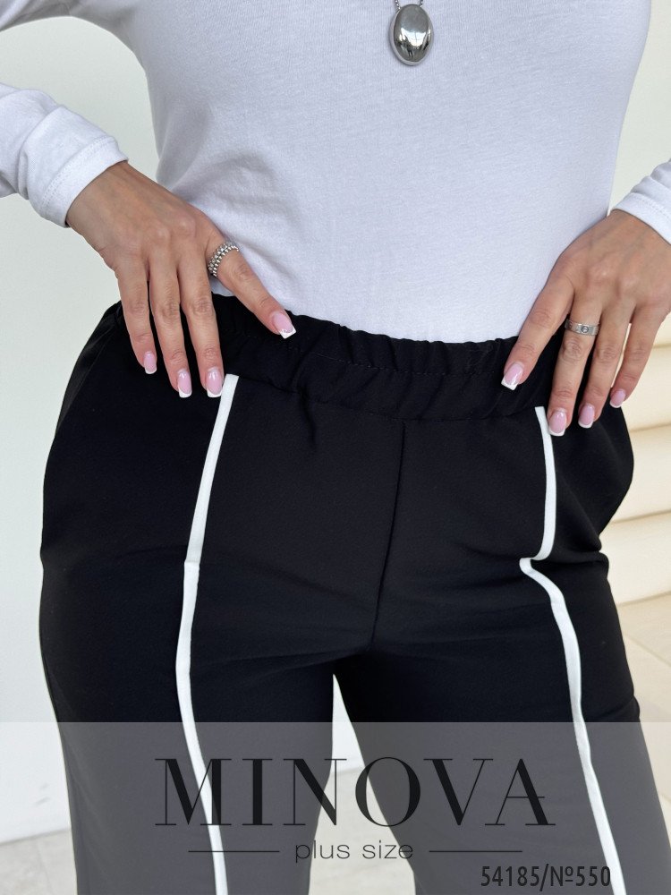 Модель виконана у прямому, злегка розкльошеному донизу крої, що візуально витягує силует і робить ноги стрункішими. Контрастні вертикальні вставки спереду створюють ефект подовження та додають образу динаміки.