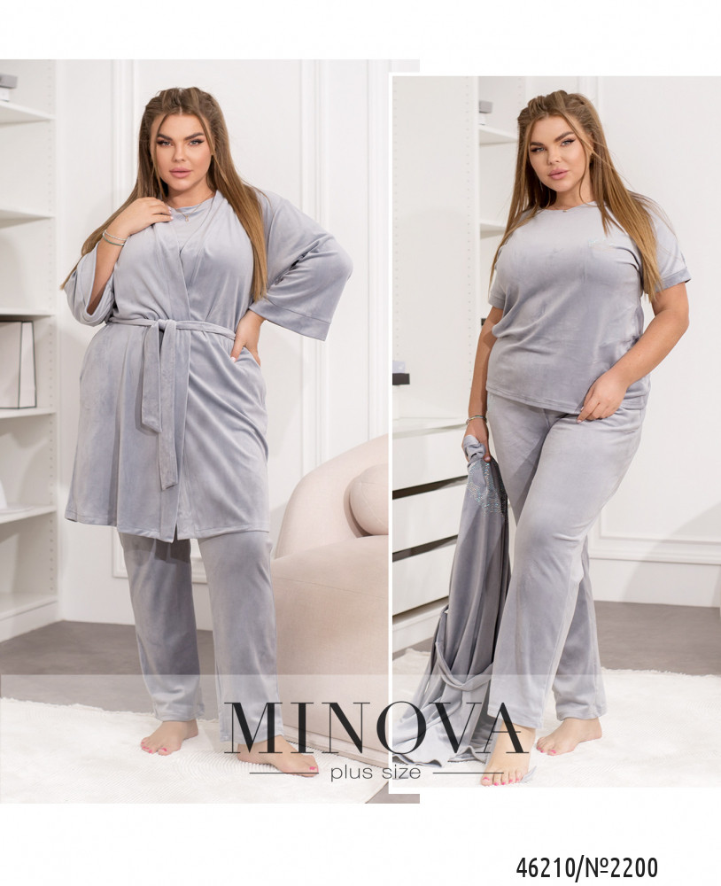 Стильний та комфортний костюм-трійка батал. В комплекті халат з кишенями по сторонам, декорований візерунком зі страз на спині, застібок немає, в комплекті пасок, для нього - дві шлівки по сторонам. Футболка без застібок та кишень, на грудях - візерунок зі страз. Горловина півкругла, рукава з невеликими м'якими манжетами. Брюки з високою талією, вшитою до пояса резинкою та кишенями в швах. Пояс/аксесіуар в комплекті.