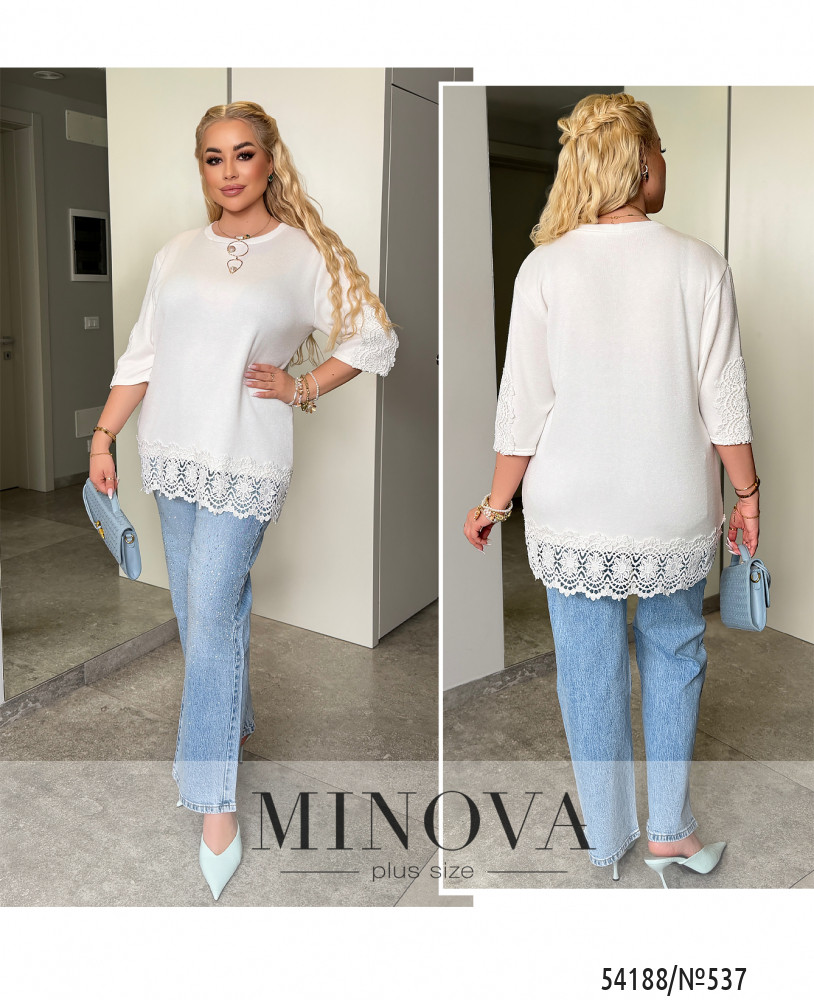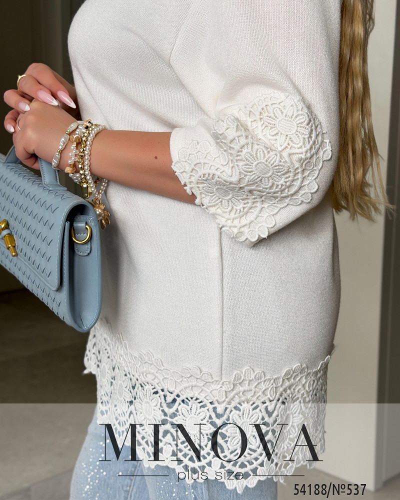 Ця кофтинка — ніжний акцент, який легко освіжає весь образ. Модель доповнена витонченим мереживом по низу, що додає жіночності та легкої романтичності. Напівкруглий виріз горловини акуратно підкреслює лінію шиї та виглядає делікатно й універсально — ідеально як для повсякденних, так і більш елегантних поєднань. Рукави довжиною 3/4 створюють легкий, витончений силует, а занижена лінія плеча додає розслабленості та сучасного настрою. Кроєм кофтинка м’яко лягає по фігурі, не обтягує та забезпечує комфорт протягом усього дня. Ідеальний варіант, який легко комбінується зі спідницями, брюками чи джинсами — виглядає ніжно, стильно та актуально.