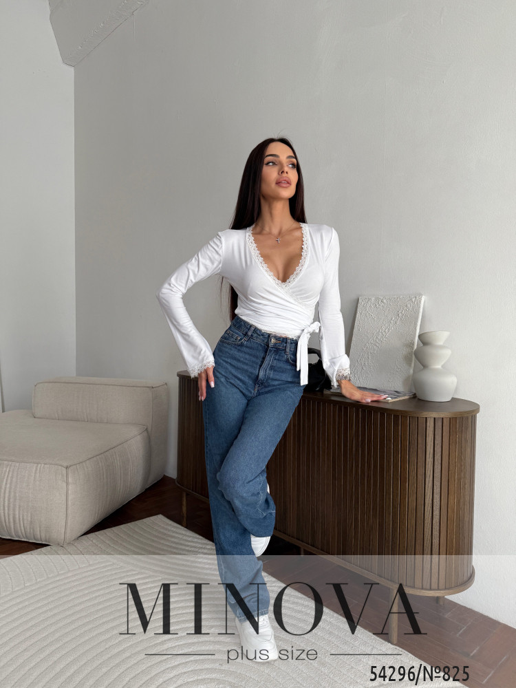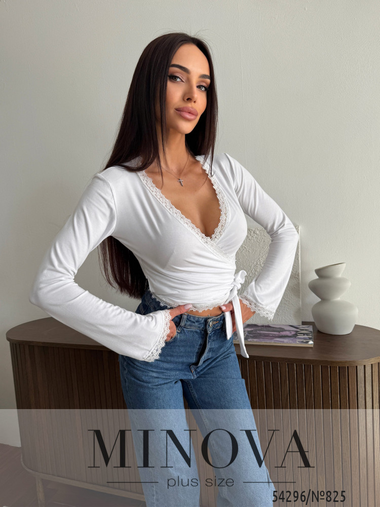 Жіноча кофтинка на запах з мереживом, позаду на зав'язках - елегантна базова модель, що поєднує жіночність та комфорт. Рукав трохи розширений до низу. Модель підкреслює талію, створюючи витончений силует і підходить для створення романтичних образів.