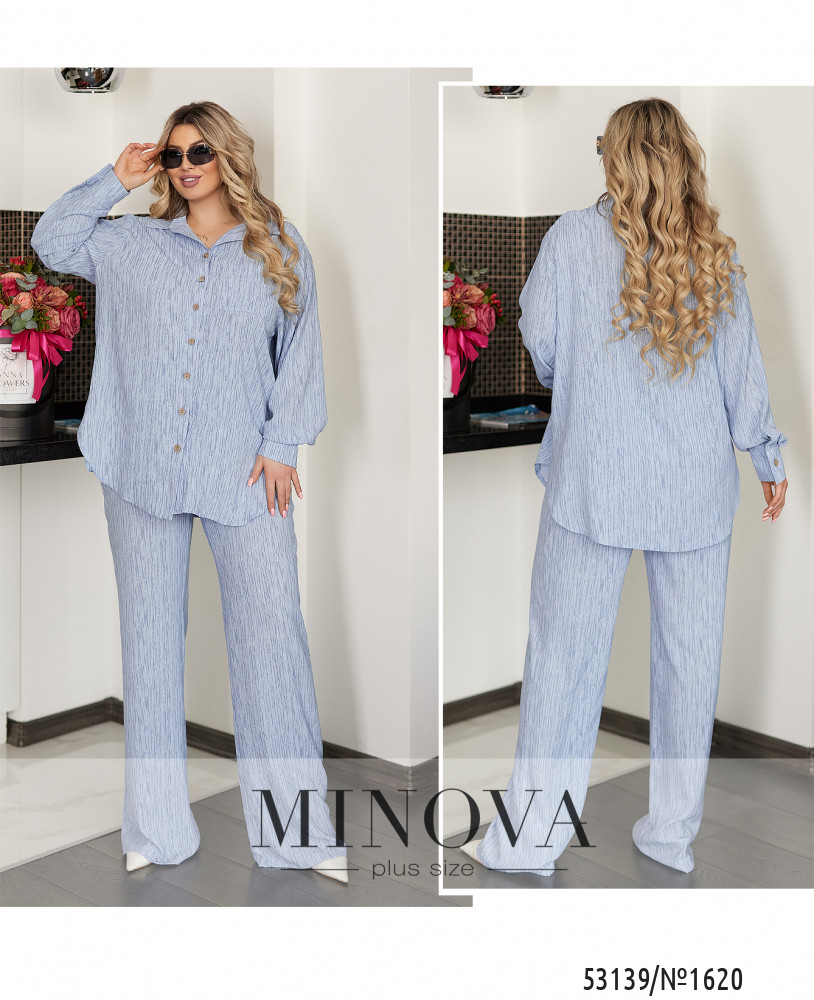 Цей костюм – ідеальне поєднання стилю та комфорту! Вільна сорочка з кишенею на грудях і спущеним рукавом створює легкий, розслаблений силует, а ґудзики додають витонченості. Брюки з високою посадкою, зручним поясом на гумці та кишенями роблять образ ще більш практичним і комфортним. А пастельна палітра відтінків дарує ніжність і елегантність, додаючи вашому стилю вишуканості. В ньому ви почуватиметесь впевнено та чарівно у будь-якій ситуації!
