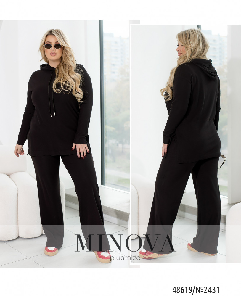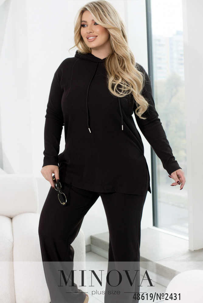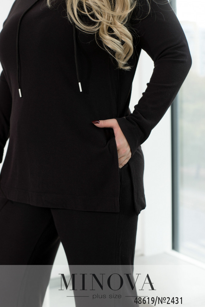 Легкий костюм-двійка, виконаний з м’якої та теплої тканини, відмінно поєднується з кросівками і великими джинсовими куртками. До його складу входить кофта крою oversize зі светром з довгими рукавами і капюшоном, а також актуальні штани-палаццо вільного крою з кишенями на резинці, вшитій по лінії талії.