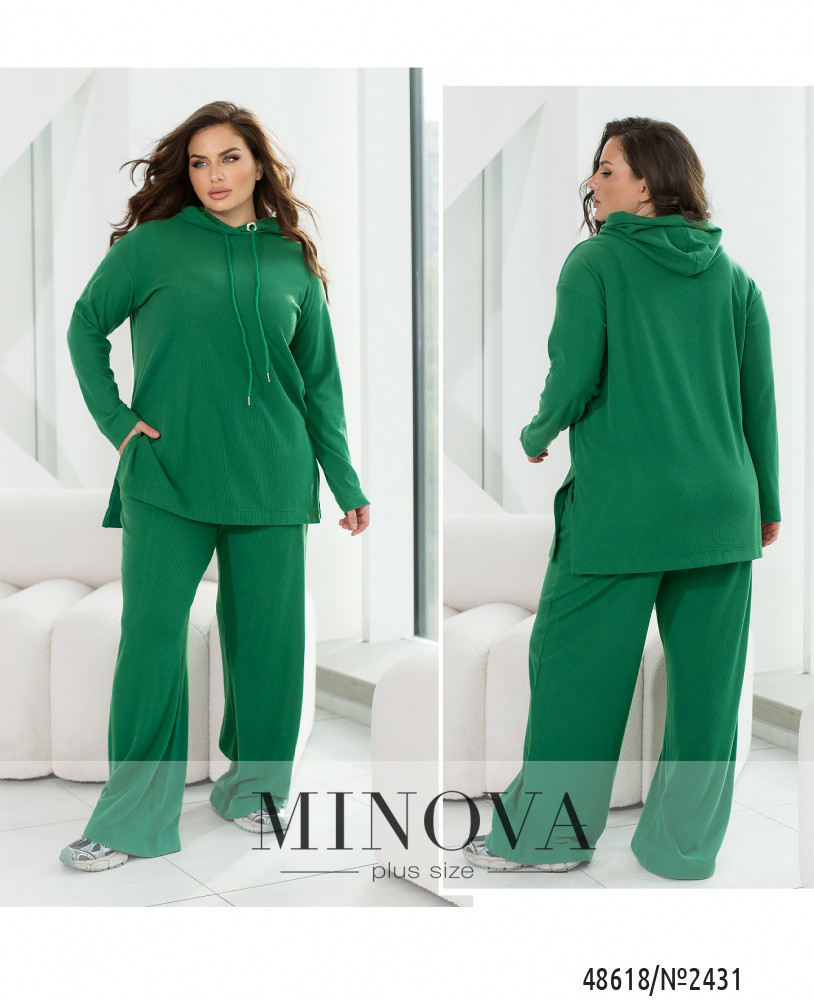 Легкий костюм-двійка, виконаний з м’якої та теплої тканини, відмінно поєднується з кросівками і великими джинсовими куртками. До його складу входить кофта крою oversize зі светром з довгими рукавами і капюшоном, а також актуальні штани-палаццо вільного крою з кишенями на резинці, вшитій по лінії талії.