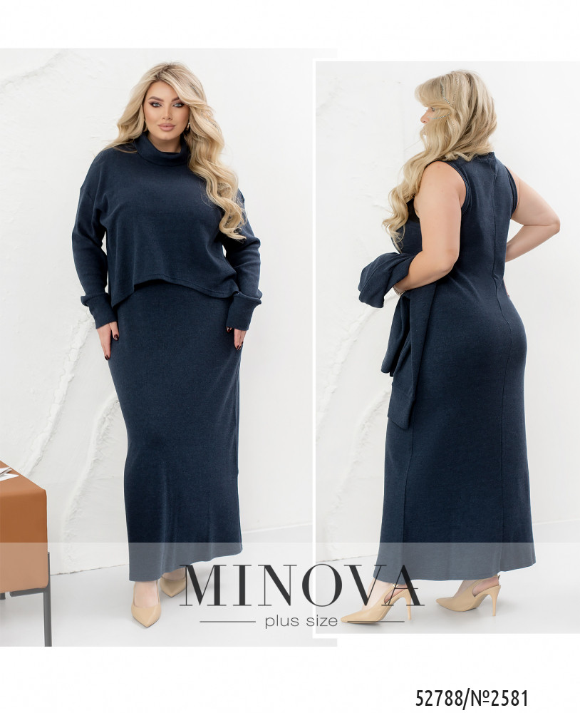 Стильний костюм, який складається з сукні та кофтинки, поєднує елегантність та комфорт в одному образі. Кофта з високою горловиною та довгими рукавами з манжетами виглядає дуже витончено, а занижена лінія плеча додає легкості та сучасного вигляду. Позаду кофтинка трохи довша, ніж спереду, що підкреслює її оригінальний стиль. Сукня максі-довжини, з прямим кроєм, створює елегантний силует, підкреслюючи витонченість фігури. Її V-подібний виріз горловини додає образу легкості та жіночності. Особливого шарму додає шов, що проходить по спинці, надаючи сукні вишуканого вигляду. Виготовлена з еластичної тканини, яка м’яко облягає тіло, сукня підлаштовується під ваші рухи, забезпечуючи максимальний комфорт і зручність. Ідеальний вибір для вечірки, урочистої події або важливого заходу, цей костюм гарантовано приверне увагу.