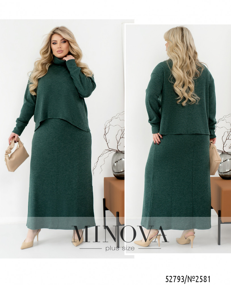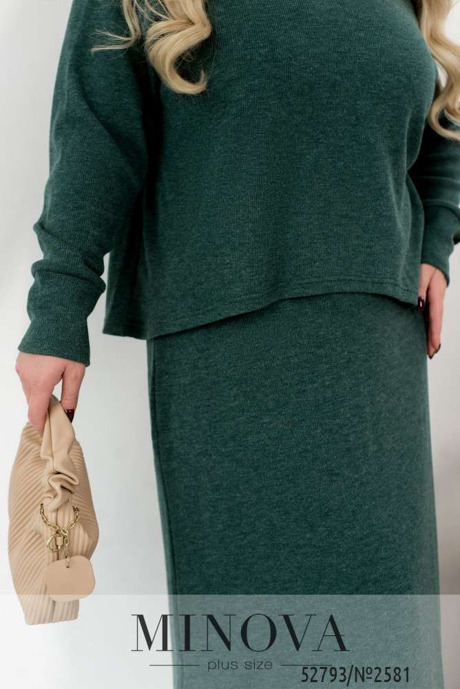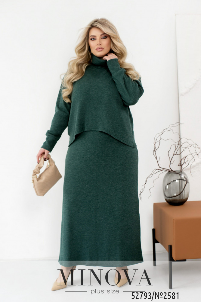 Стильний костюм, який складається з сукні та кофтинки, поєднує елегантність та комфорт в одному образі. Кофта з високою горловиною та довгими рукавами з манжетами виглядає дуже витончено, а занижена лінія плеча додає легкості та сучасного вигляду. Позаду кофтинка трохи довша, ніж спереду, що підкреслює її оригінальний стиль.