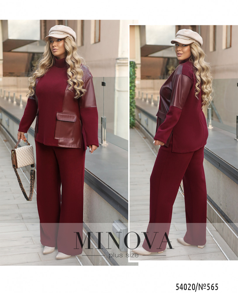 Стильний костюм у кежуал-форматі — комфорт, який виглядає дорого. Кофта вільного прямого крою з високим напівстійким коміром та декоративними вставками зі штучної шкіри спереду й на рукавах виглядає ефектно й сучасно. Накладні кишені та розрізи з боків додають зручності та легкості. Брюки прямого вільного крою з високою посадкою та еластичним поясом ідеально доповнюють образ. М’який трикотаж приємно прилягає до тіла, забезпечуючи комфорт у прохолодну погоду. Цей костюм — ідеальний баланс між практичністю, стилем і впевненістю в кожному русі.