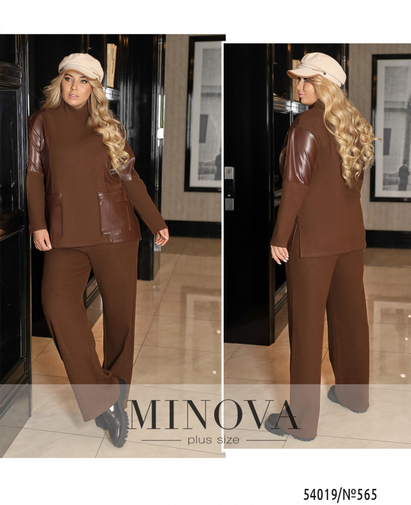 Стильний костюм у кежуал-форматі — комфорт, який виглядає дорого. Кофта вільного прямого крою з високим напівстійким коміром та декоративними вставками зі штучної шкіри спереду й на рукавах виглядає ефектно й сучасно. Накладні кишені та розрізи з боків додають зручності та легкості. Брюки прямого вільного крою з високою посадкою та еластичним поясом ідеально доповнюють образ. М’який трикотаж приємно прилягає до тіла, забезпечуючи комфорт у прохолодну погоду. Цей костюм — ідеальний баланс між практичністю, стилем і впевненістю в кожному русі.