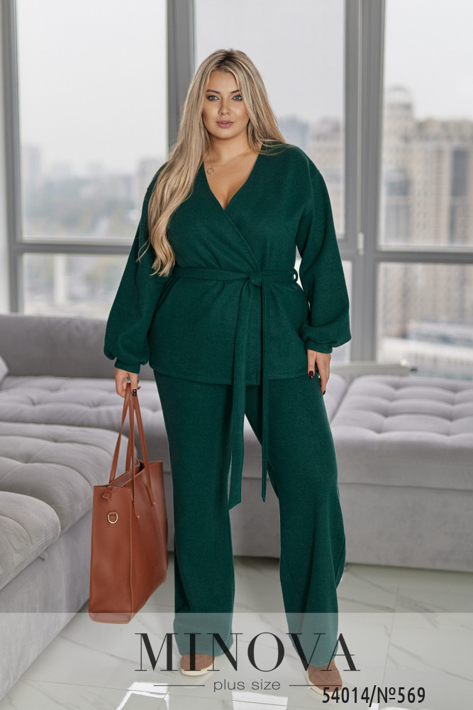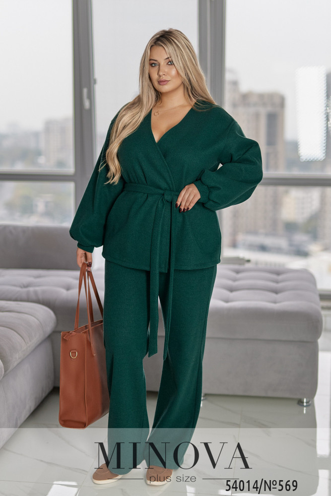 Вишуканий костюм, у якому комфорт поєднано з елегантністю. Комплект складається з вільного жакета із запахом та пояса й широких прямих брюк. Жакет фасону кимоно має вільний силует без застібки, а пояс дозволяє красиво підкреслити талію. Довгі рукави зі спущеною лінією плеча та м’якими зборками біля манжетів додають образу легкості й жіночності. Брюки прямого вільного крою з високою посадкою та еластичним поясом забезпечують ідеальну посадку й комфорт у русі. М’який матеріал приємно огортає, створюючи відчуття затишку та впевненості. Носи цей костюм із усмішкою — і світ помітить твою гармонію.