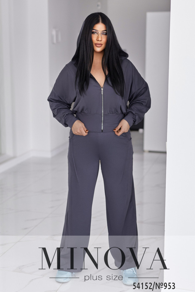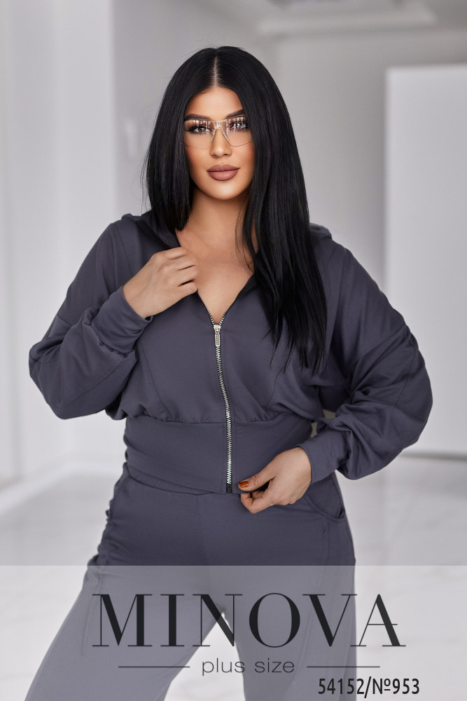 Жіночий костюм у сучасному міському стилі, що поєднує комфорт і виразний силует. Комплект складається з кофти та штанів. Кофта укороченого крою з капюшоном виконана з рельєфними швами спереду, які красиво формують фігуру. Застібається на блискавку. Рукави об’ємні, зі спущеною лінією плеча та м’якою призбіркою, манжети — з основної тканини. По низу — широкий притачний пояс, який підкреслює талію та створює акуратну посадку. Штани вільного крою з об’ємом у зоні стегон і штанин. Висока посадка та еластичний пояс на гумці забезпечують комфорт протягом усього дня. Є бічні кишені з рельєфними швами. Низ штанин доповнений резинкою та регулятором-стопером, що дозволяє змінювати форму та фіксувати бажаний об’єм. Це костюм, у якому зручно рухатися, жити та виглядати стильно. Насичені трендові кольори додають образу глибини й роблять його виразним та дорогим на вигляд.