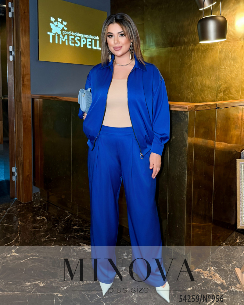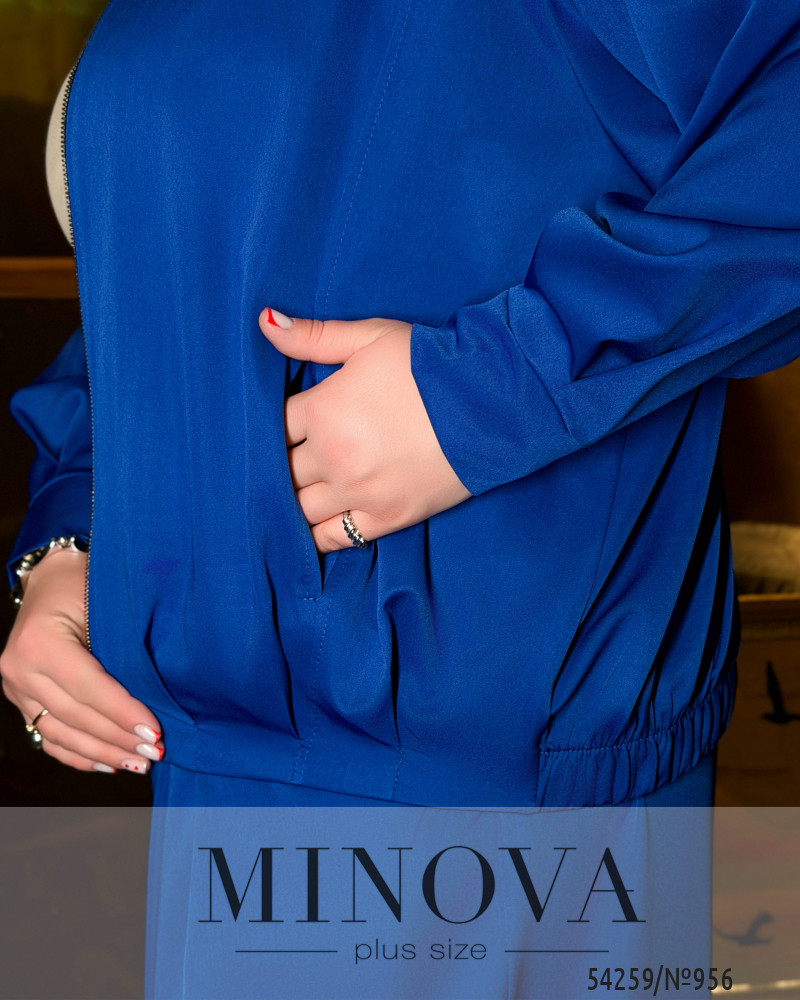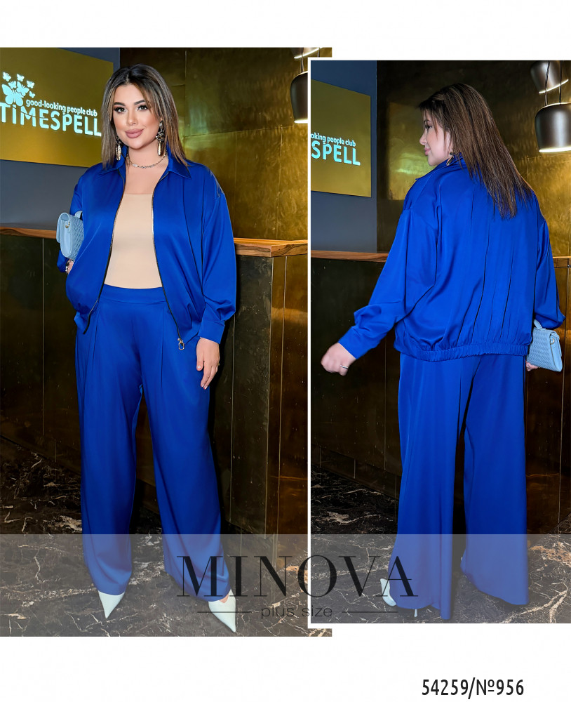 Кофта-бомбер вільного крою м’яко лягає по фігурі: спереду понизу — делікатні склади, позаду — резинка, що дозволяє регулювати посадку та підкреслює силует. Спущена лінія плеча й об’ємний рукав із манжетом додають образу легкості. Застібка на блискавку — зручна та практична деталь. Штани палаццо широкого прямого крою з високою комфортною посадкою та м’якими складами спереду красиво витягують силует. Є кишені для ще більшої зручності. Вільний крій створює витягнутий, акуратний силует і виглядає доречно як у повсякденних образах, так і для роботи чи зустрічей. Пояс НЕ входить в комплект.
