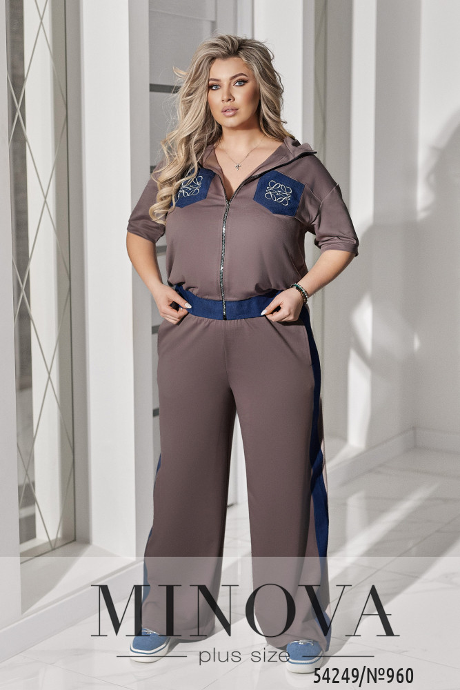 Модель поєднує сучасний дизайн і максимальний комфорт. Кофта вільного силуету на блискавці прикрашена стильними декоративними кишенями з вишивкою, що додають образу елегантності .Короткий рукав зі спущеною лінією плеча, комір стійка. Широкі штани в поясі на гумці, високої посадки, збоків кишені, та контрастними лампасами створюють витончений силует і забезпечують свободу рухів. Прикраса входить в комплект. Пояс НЕ входить в комплект.