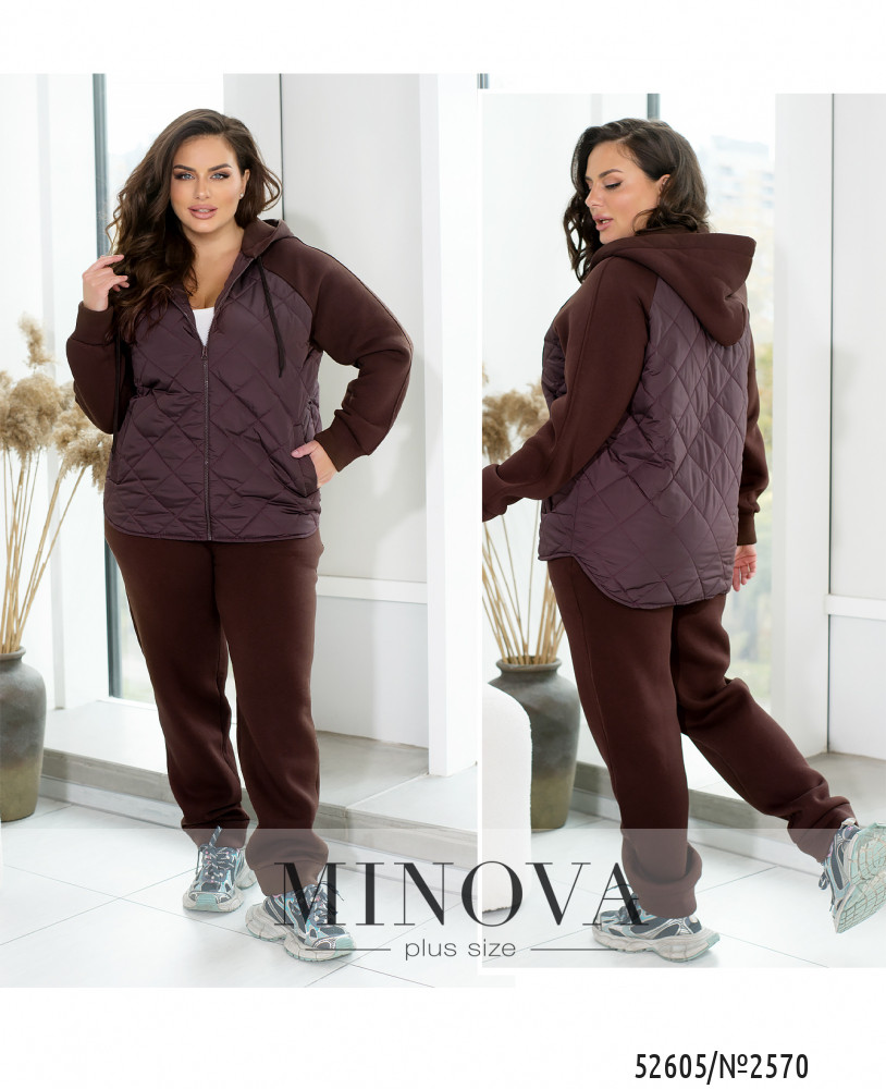 Спортивний костюм із кофтою на змійці, пошитий із поєднання тканин стьобана плащівка та трьохнитки, створений для комфорту та стилю. Кофта оснащена капюшоном зі шнурком, що проходить через люверси, забезпечуючи захист і регулювання. Спереду розташовані врізні кишені для зручності. Рукава з трьохнитки з манжетами забезпечують комфортну посадку. Штани з високою посадкою на еластичній гумці з боковими кишенями і манжетами внизу додають функціональності та забезпечують тепло. Ідеальний вибір для активного відпочинку чи повсякденних занять.