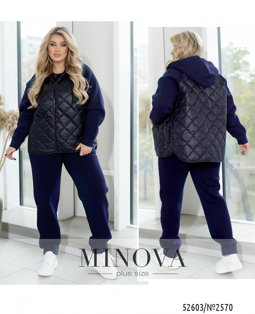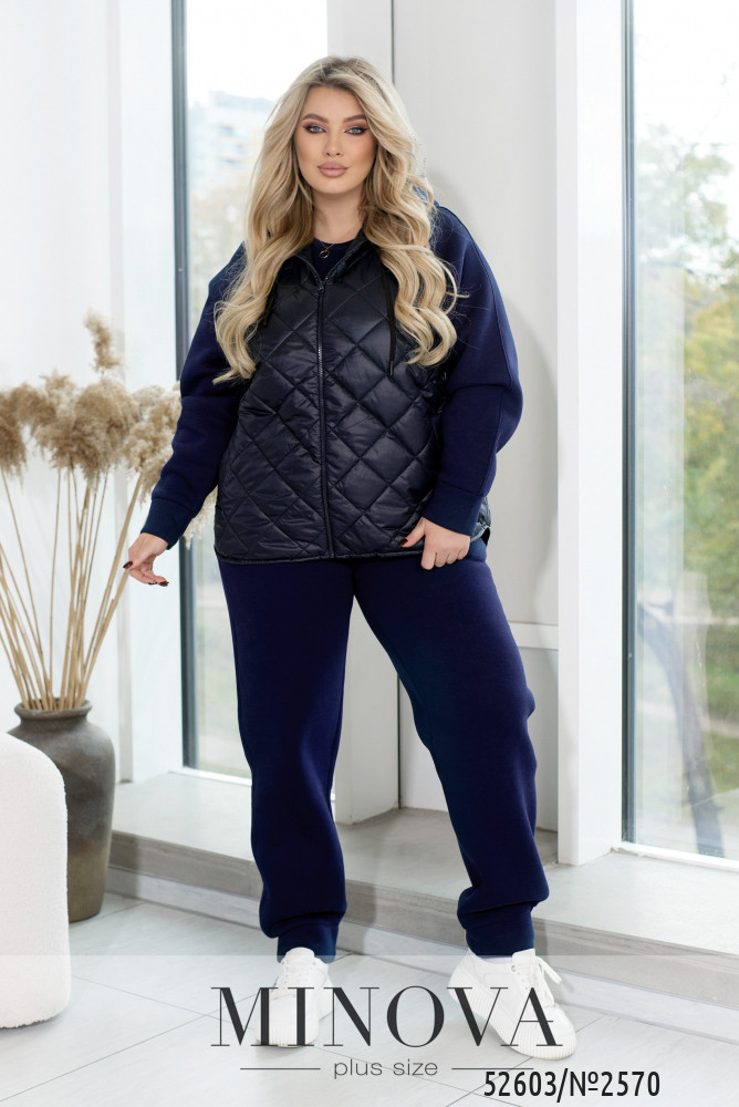 Спортивний костюм із кофтою на змійці, пошитий із поєднання тканин стьобана плащівка та трьохнитки, створений для комфорту та стилю. Кофта оснащена капюшоном зі шнурком, що проходить через люверси, забезпечуючи захист і регулювання. Спереду розташовані врізні кишені для зручності. Рукава з трьохнитки з манжетами забезпечують комфортну посадку. Штани з високою посадкою на еластичній гумці з боковими кишенями і манжетами внизу додають функціональності та забезпечують тепло. Ідеальний вибір для активного відпочинку чи повсякденних занять.