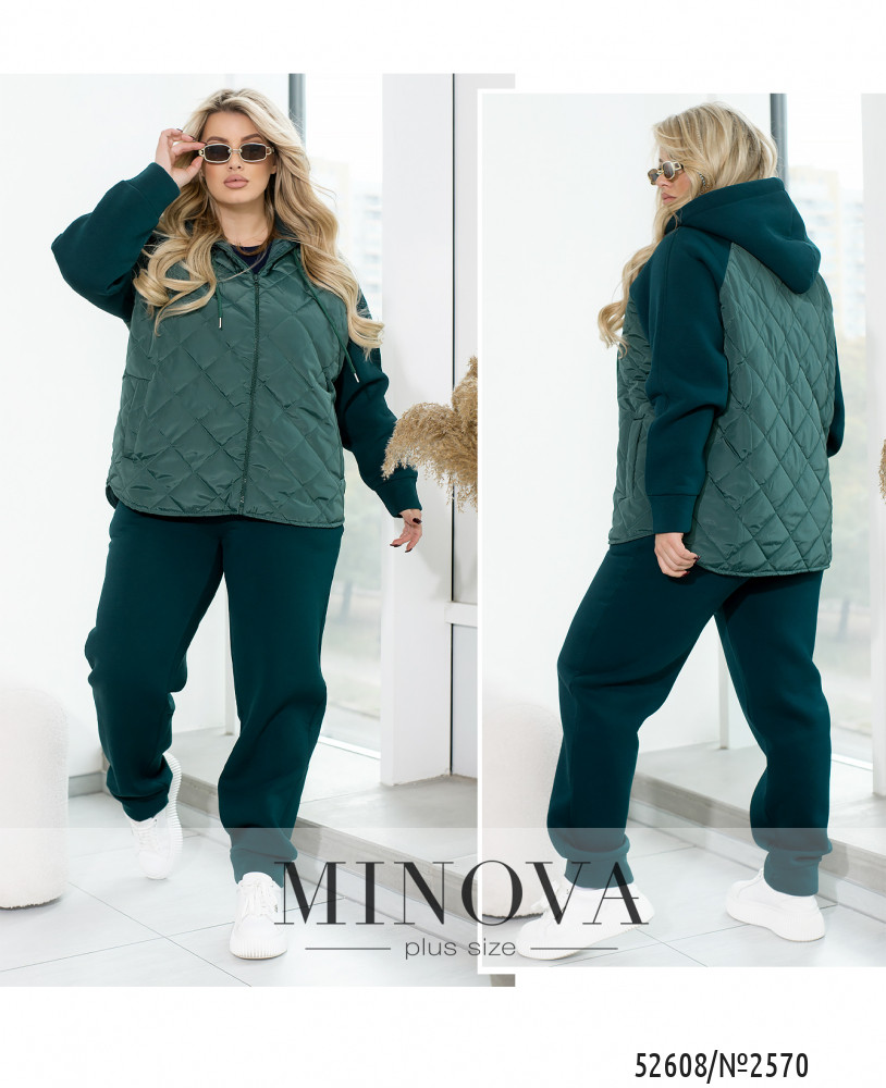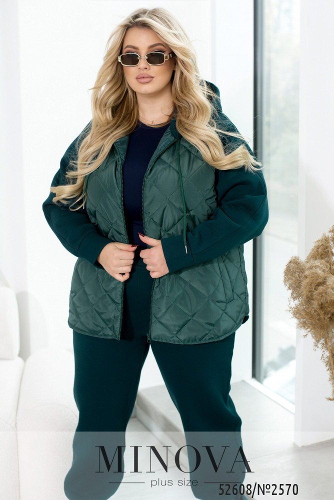 Спортивний костюм із кофтою на змійці, пошитий із поєднання тканин стьобана плащівка та трьохнитки, створений для комфорту та стилю. Кофта оснащена капюшоном зі шнурком, що проходить через люверси, забезпечуючи захист і регулювання. Спереду розташовані врізні кишені для зручності. Рукава з трьохнитки з манжетами забезпечують комфортну посадку. Штани з високою посадкою на еластичній гумці з боковими кишенями і манжетами внизу додають функціональності та забезпечують тепло. Ідеальний вибір для активного відпочинку чи повсякденних занять.