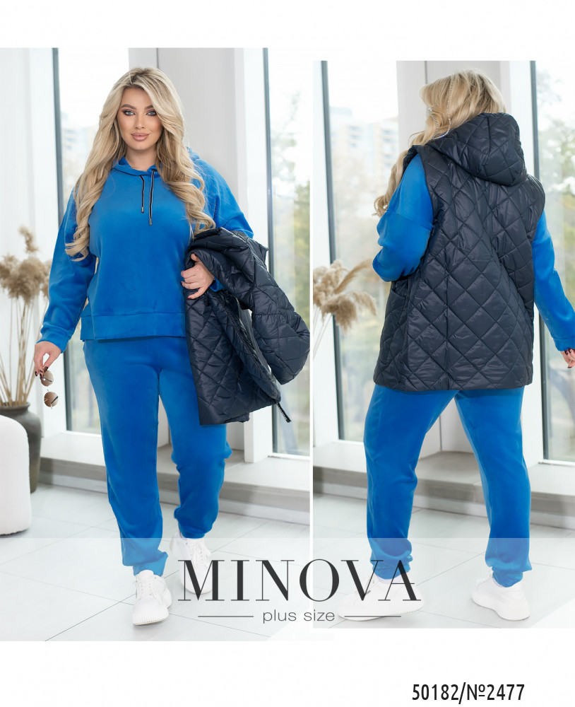 Зустрічайте наш універсальний костюм трійка, створений для стильних і зручних образів у прохолодну погоду. Комплект складається з жилетки з капюшоном та накладними кишенями, кофти зі спущеними рукавами та капюшоном зі шнурком, а також прямих штанів з середньою посадкою і кишенями по боках.Жилетка додає практичності та стилю завдяки капюшону і накладним кишеням. Кофта з капюшоном і спущеними рукавами створює невимушений і затишний образ. Прямі штани з середньою посадкою забезпечують комфорт і стиль. Вони практичні завдяки кишеням по боках і низу на резинці. Цей костюм — вибір активних жінок, які цінують якість і стиль.Ідеальний варіант, для жінок, які поспішають та полюбляють бути в комфорті. Доповніть образ кросівками чи об'ємними чоботями