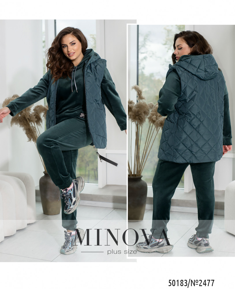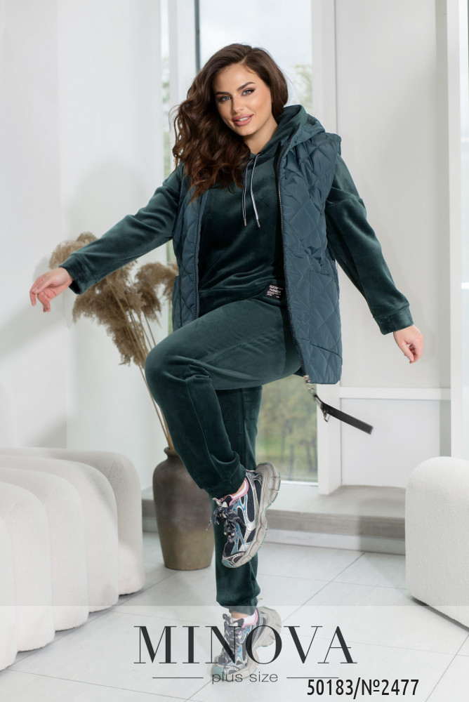 Зустрічайте наш універсальний костюм трійка, створений для стильних і зручних образів у прохолодну погоду. Комплект складається з жилетки з капюшоном та накладними кишенями, кофти зі спущеними рукавами та капюшоном зі шнурком, а також прямих штанів з середньою посадкою і кишенями по боках.Жилетка додає практичності та стилю завдяки капюшону і накладним кишеням. Кофта з капюшоном і спущеними рукавами створює невимушений і затишний образ. Прямі штани з середньою посадкою забезпечують комфорт і стиль. Вони практичні завдяки кишеням по боках і низу на резинці. Цей костюм — вибір активних жінок, які цінують якість і стиль.Ідеальний варіант, для жінок, які поспішають та полюбляють бути в комфорті. Доповніть образ кросівками чи об'ємними чоботями