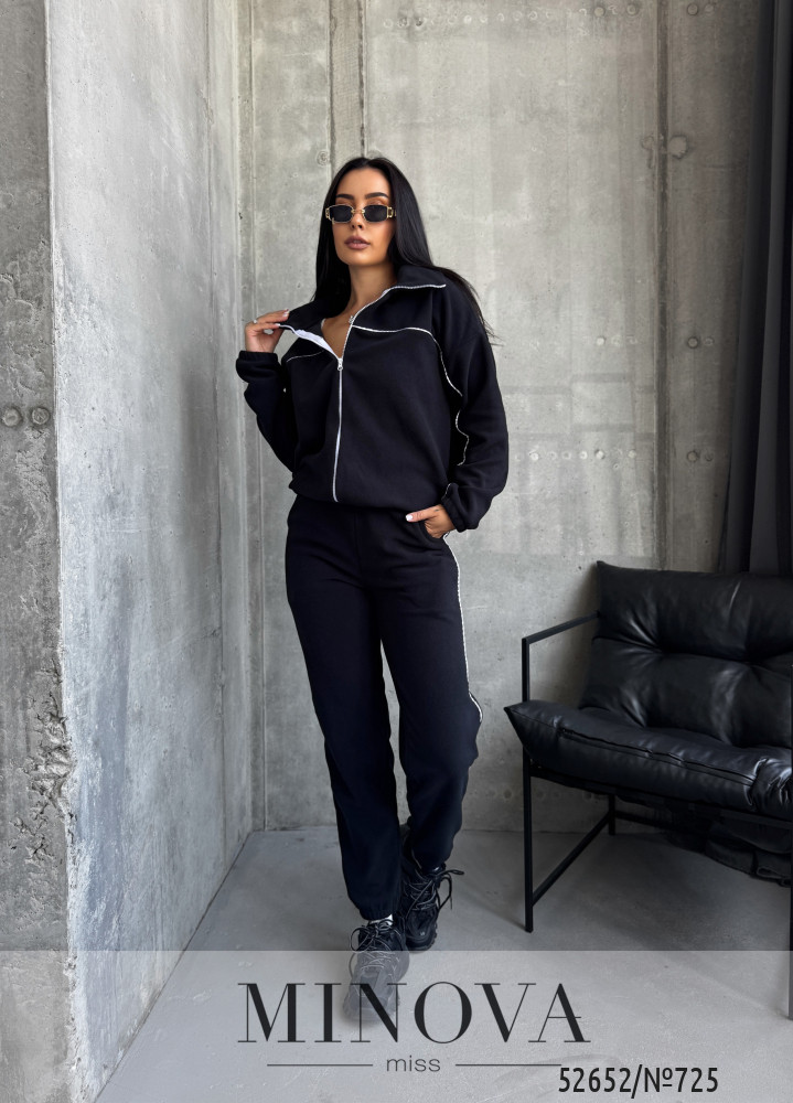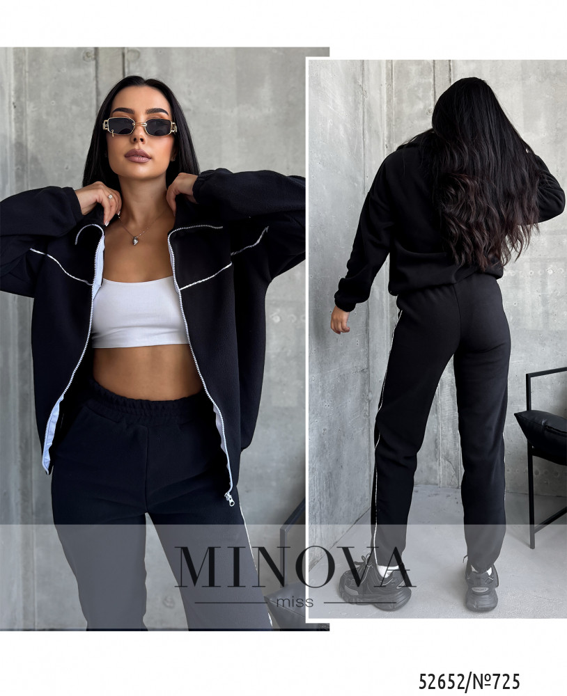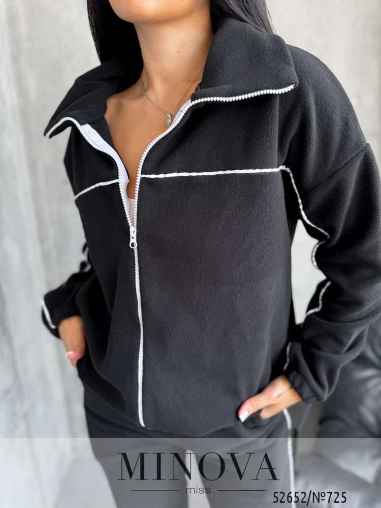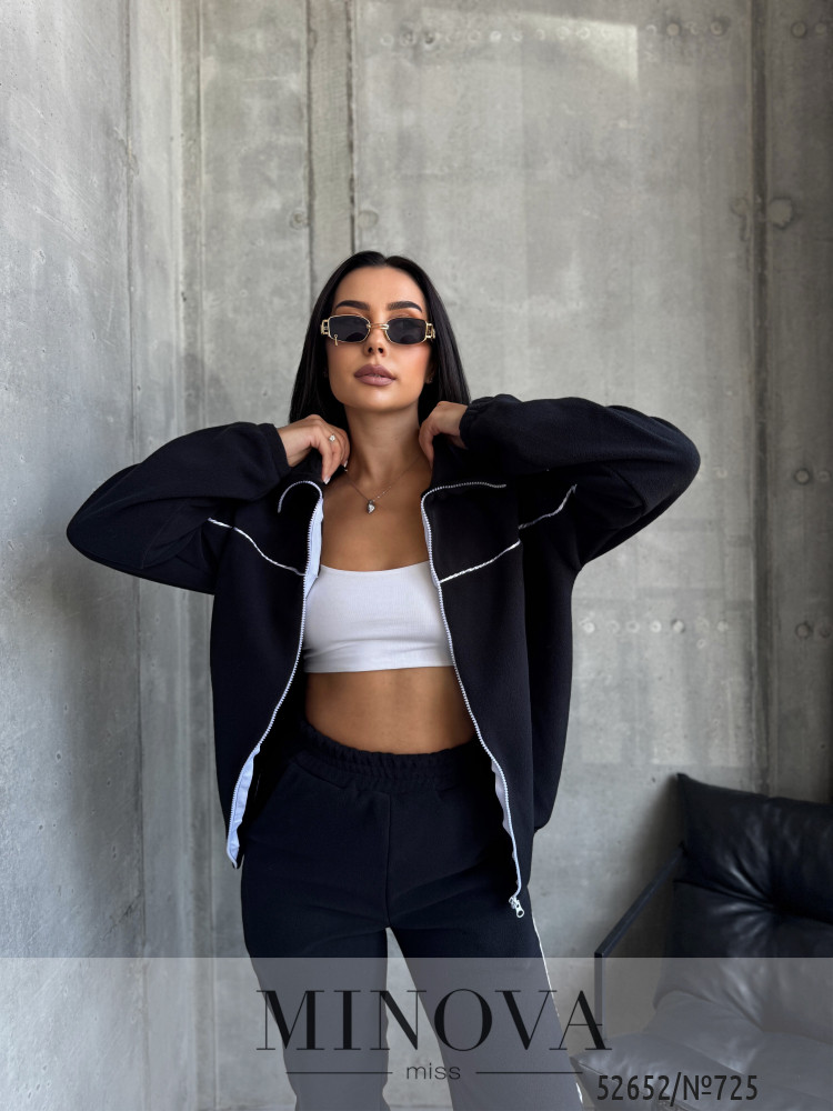 Флісовий спортивний костюм, що поєднує елегантність і зручність, стане відмінним доповненням до вашого гардеробу.офта вільного крою застібається на блискавку, має довгі рукави та акцентну лінію, що проходить від одного рукава через груди до іншого, надаючи елегантний вигляд. Штани джогери з двома кишенями забезпечують зручність і практичність для повсякденного використання.