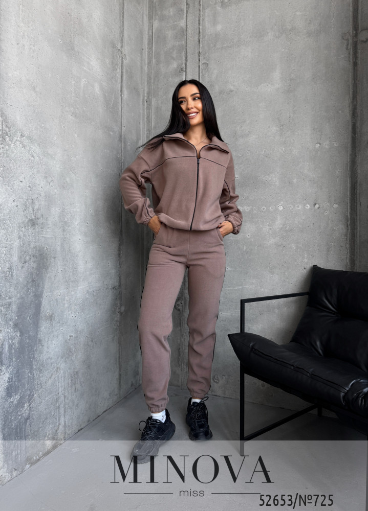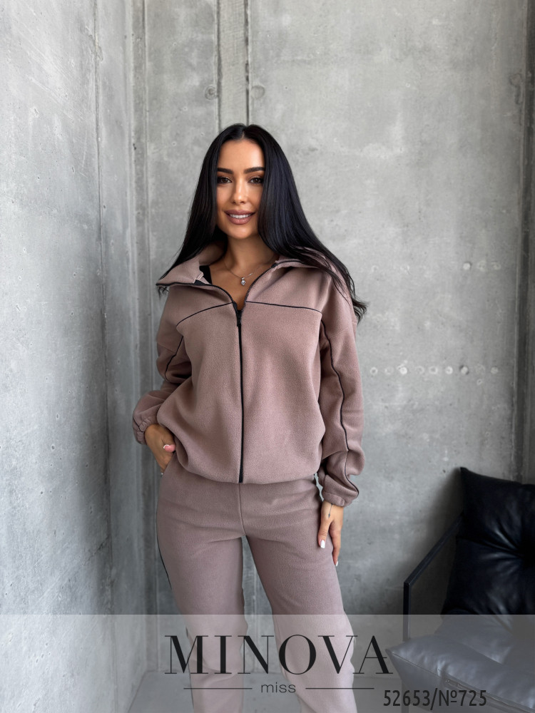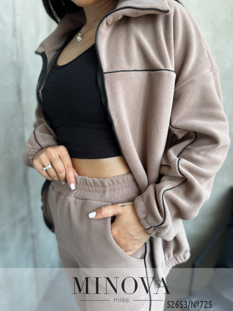Флісовий спортивний костюм, що поєднує елегантність і зручність, стане відмінним доповненням до вашого гардеробу.офта вільного крою застібається на блискавку, має довгі рукави та акцентну лінію, що проходить від одного рукава через груди до іншого, надаючи елегантний вигляд. Штани джогери з двома кишенями забезпечують зручність і практичність для повсякденного використання.