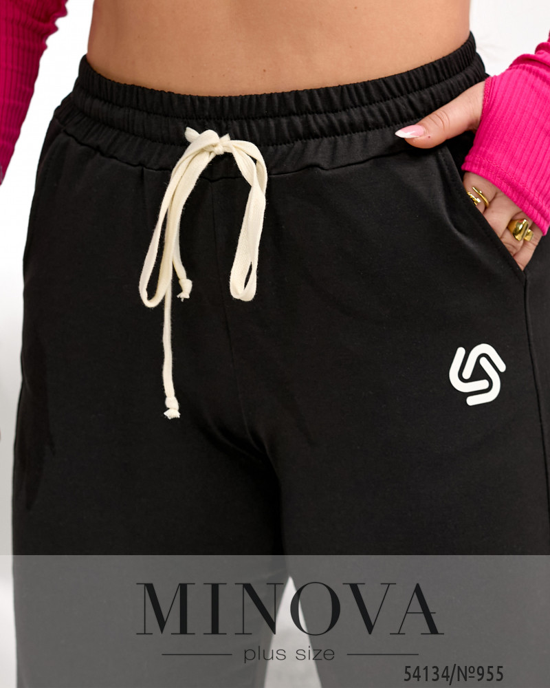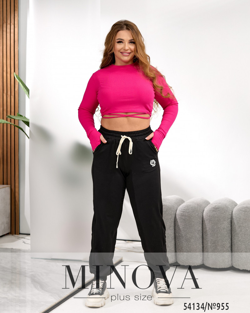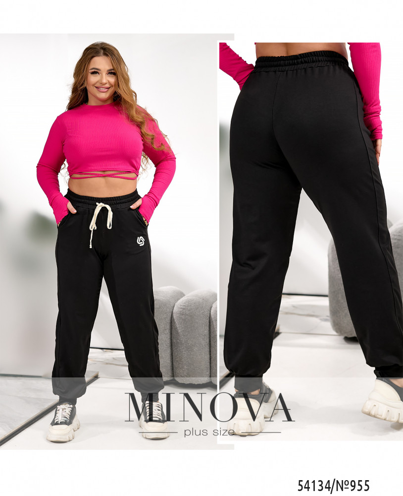 54-56 р-р: довжина брюк по внутрішньому шву 76см, довжина брюк по зовнішньому шву з урахуванням пояса 104см, ОТ - 80-118см, ОС - 122см.