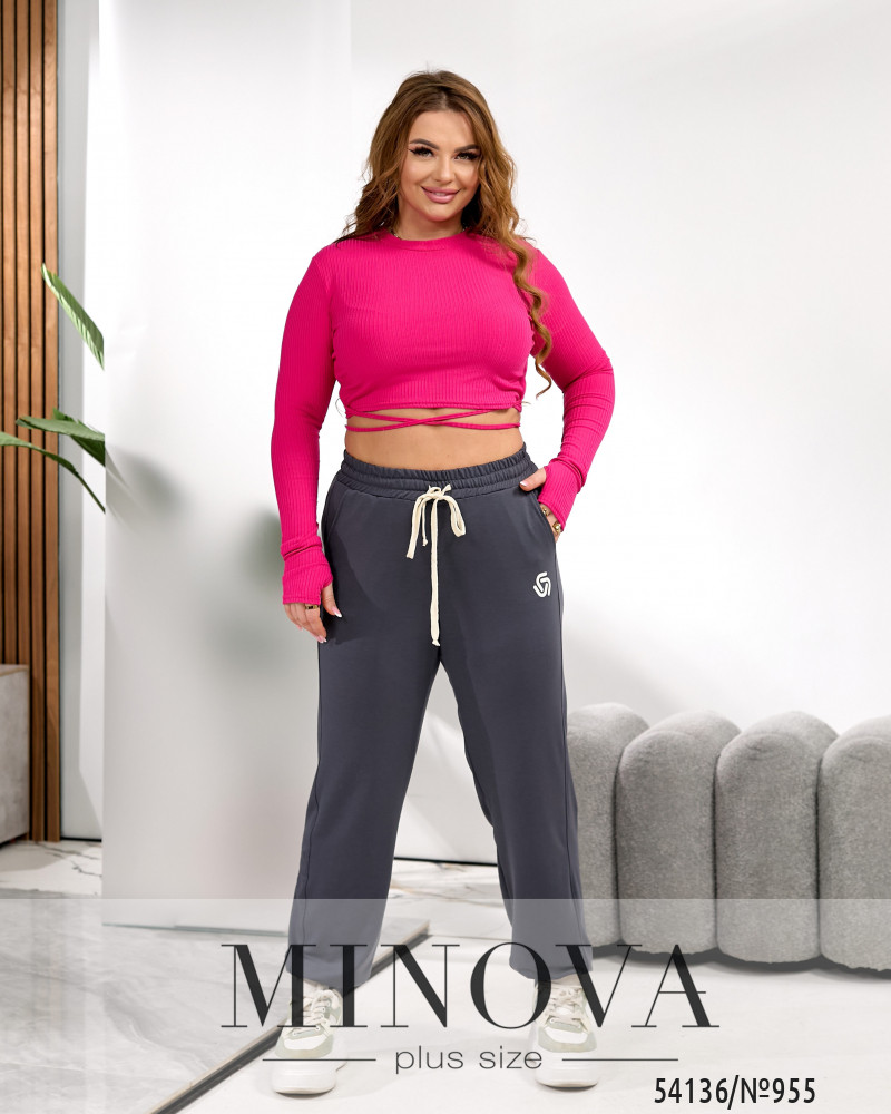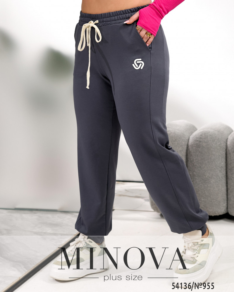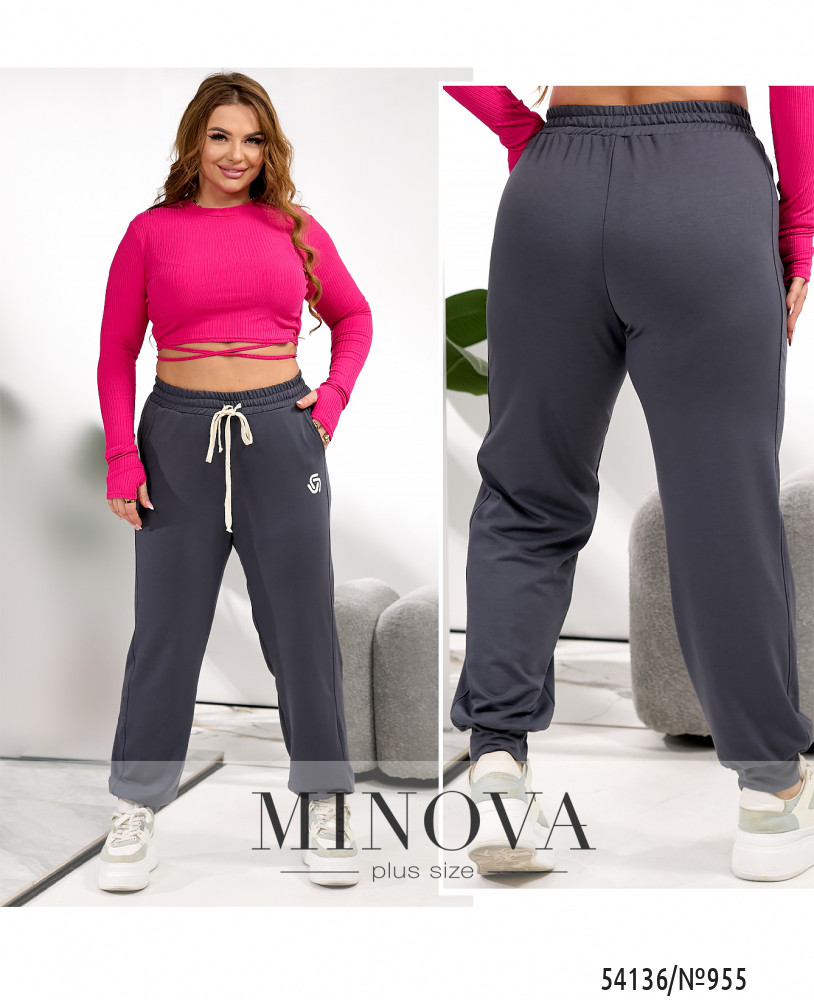 54-56 р-р: довжина брюк по внутрішньому шву 76см, довжина брюк по зовнішньому шву з урахуванням пояса 104см, ОТ - 80-118см, ОС - 122см.