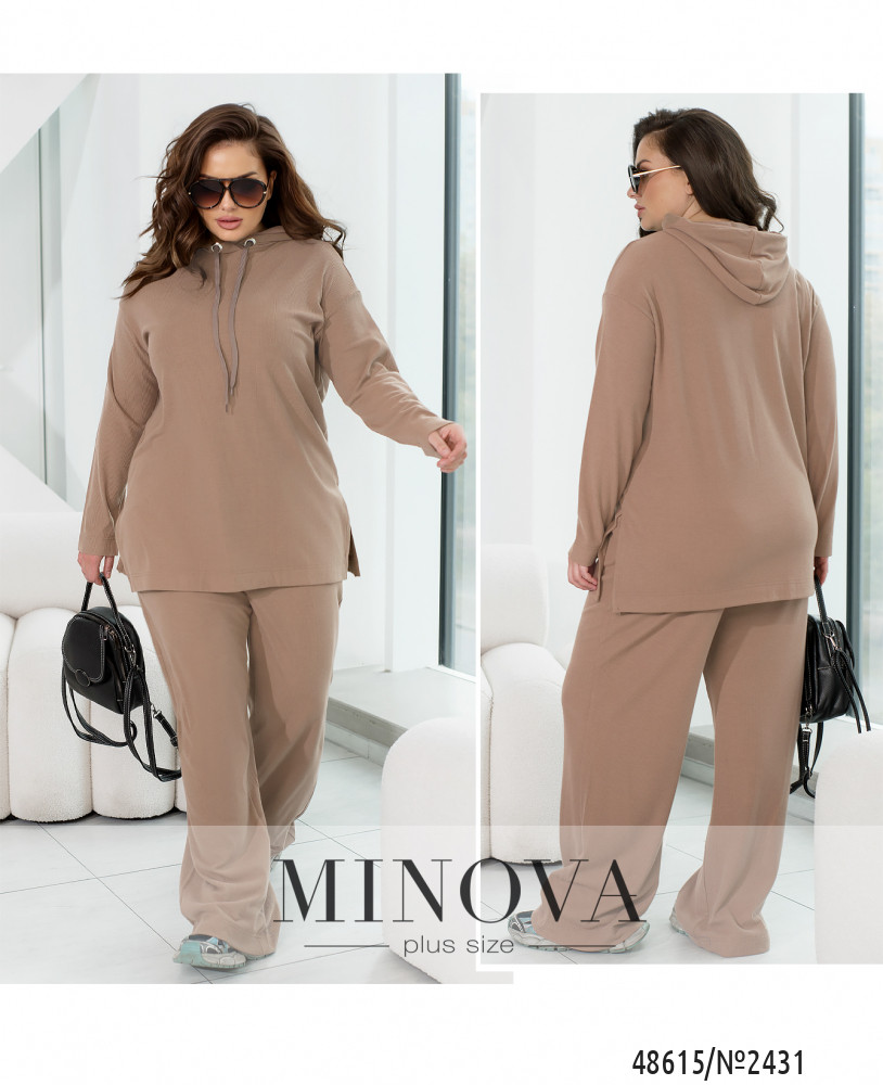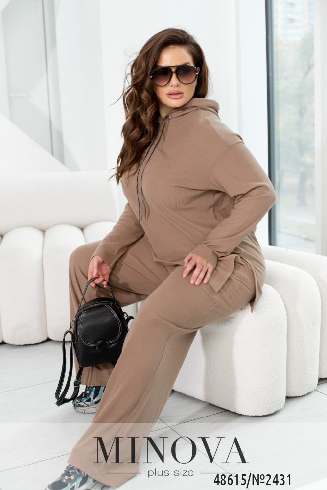 Легкий костюм-двійка, виконаний з м’якої та теплої тканини, відмінно поєднується з кросівками і великими джинсовими куртками. До його складу входить кофта крою oversize зі светром з довгими рукавами і капюшоном, а також актуальні штани-палаццо вільного крою з кишенями на резинці, вшитій по лінії талії.