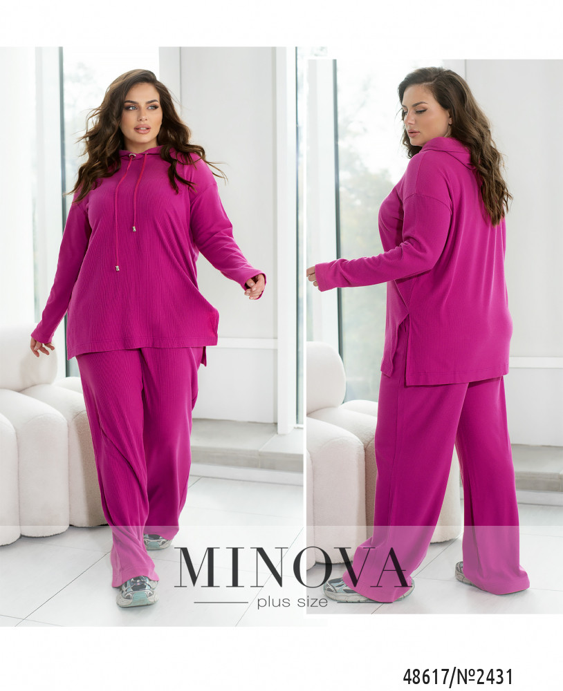 Легкий костюм-двійка, виконаний з м’якої та теплої тканини, відмінно поєднується з кросівками і великими джинсовими куртками. До його складу входить кофта крою oversize зі светром з довгими рукавами і капюшоном, а також актуальні штани-палаццо вільного крою з кишенями на резинці, вшитій по лінії талії.