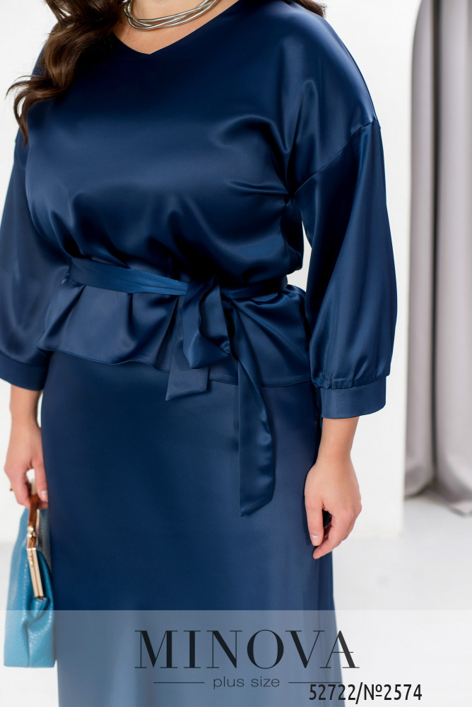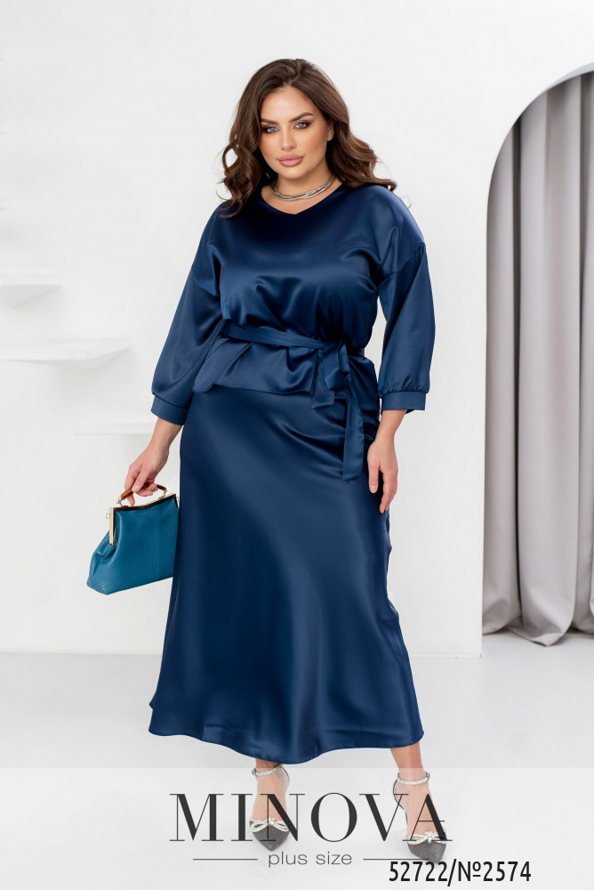 Елегантний святковий костюм зі спідницею, створений із розкішного костюмного шовку, стане вашим ідеальним образом для новорічних свят. Він поєднує витонченість і комфорт, роблячи вас зіркою будь-якої святкової події. Блуза з V-подібним вирізом створює акцент на зоні декольте, додаючи образу жіночності. Спущена лінія плечей та рукави довжиною 3/4 з манжетами на ґудзиках забезпечують стильний вигляд і зручність. Довга спідниця на резинці комфортно сідає по фігурі, а текстильний пояс, що входить до комплекту, дозволяє підкреслити талію та додає завершеності образу. Цей костюм створений, щоб ви відчували себе впевнено й виглядали розкішно під час зустрічі Нового року чи будь-якого іншого особливого заходу.