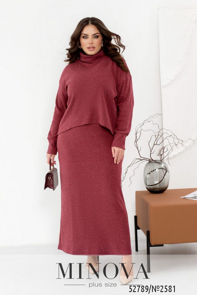 Стильний костюм, який складається з сукні та кофтинки, поєднує елегантність та комфорт в одному образі. Кофта з високою горловиною та довгими рукавами з манжетами виглядає дуже витончено, а занижена лінія плеча додає легкості та сучасного вигляду. Позаду кофтинка трохи довша, ніж спереду, що підкреслює її оригінальний стиль.