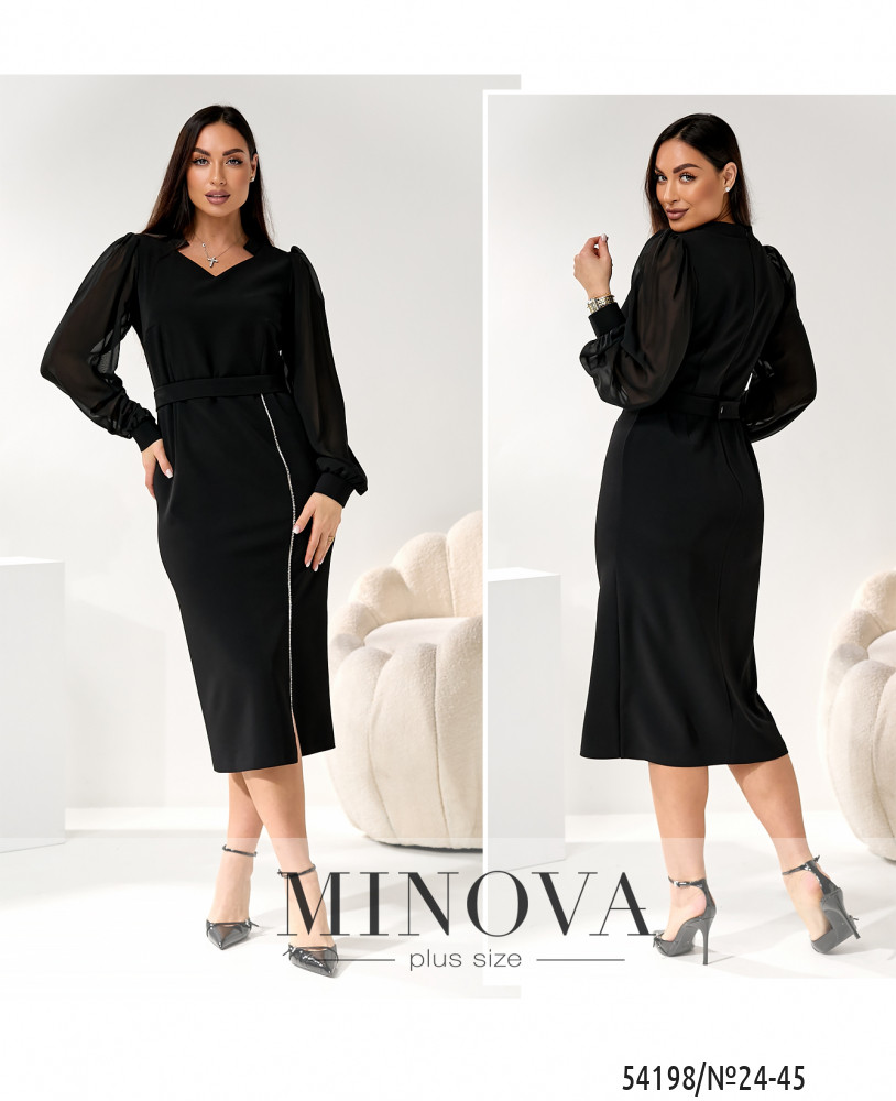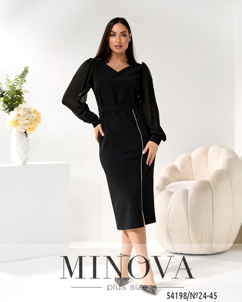 Елегантна міді сукня з приталеним силуетом красиво підкреслює талію та плавно окреслює лінію стегон. Верх виконаний з легкої напівпрозорої тканини — рукави вільні, зібрані на манжетах, додають образу ніжності й балансують силует. Акуратний V-подібний виріз витончено відкриває зону декольте.