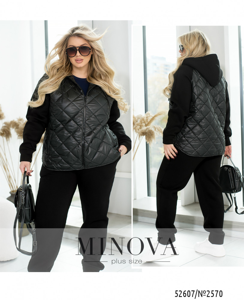 Спортивний костюм із кофтою на змійці, пошитий із поєднання тканин стьобана плащівка та трьохнитки, створений для комфорту та стилю. Кофта оснащена капюшоном зі шнурком, що проходить через люверси, забезпечуючи захист і регулювання. Спереду розташовані врізні кишені для зручності. Рукава з трьохнитки з манжетами забезпечують комфортну посадку. Штани з високою посадкою на еластичній гумці з боковими кишенями і манжетами внизу додають функціональності та забезпечують тепло. Ідеальний вибір для активного відпочинку чи повсякденних занять.