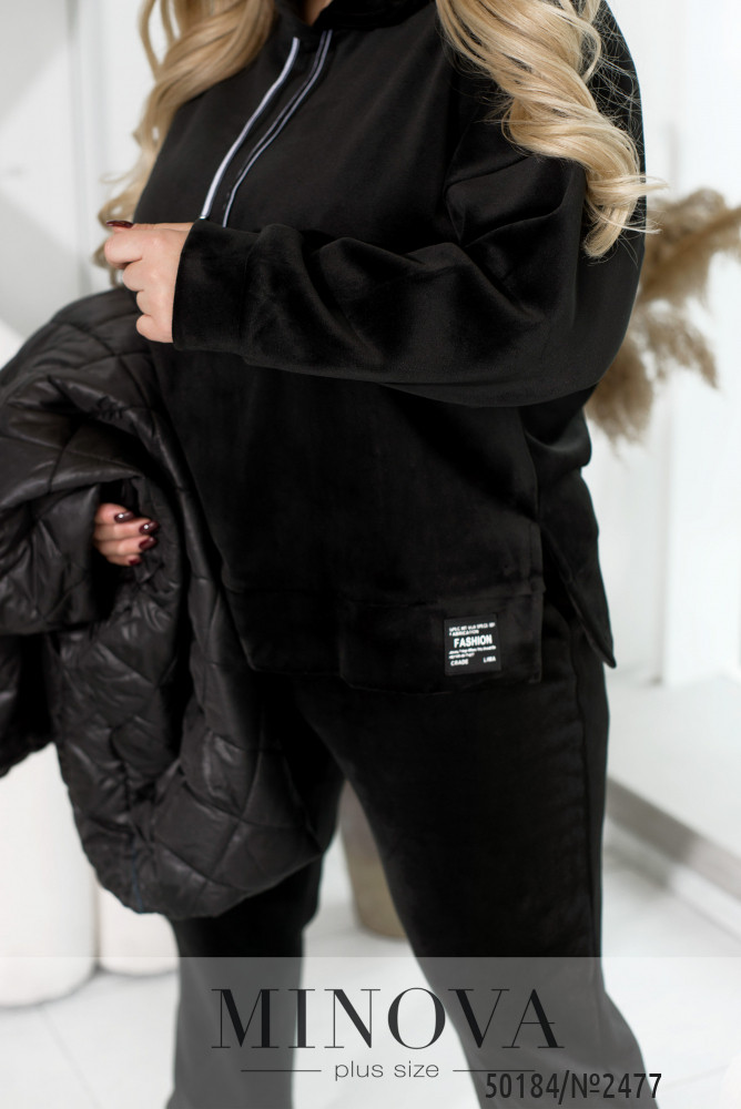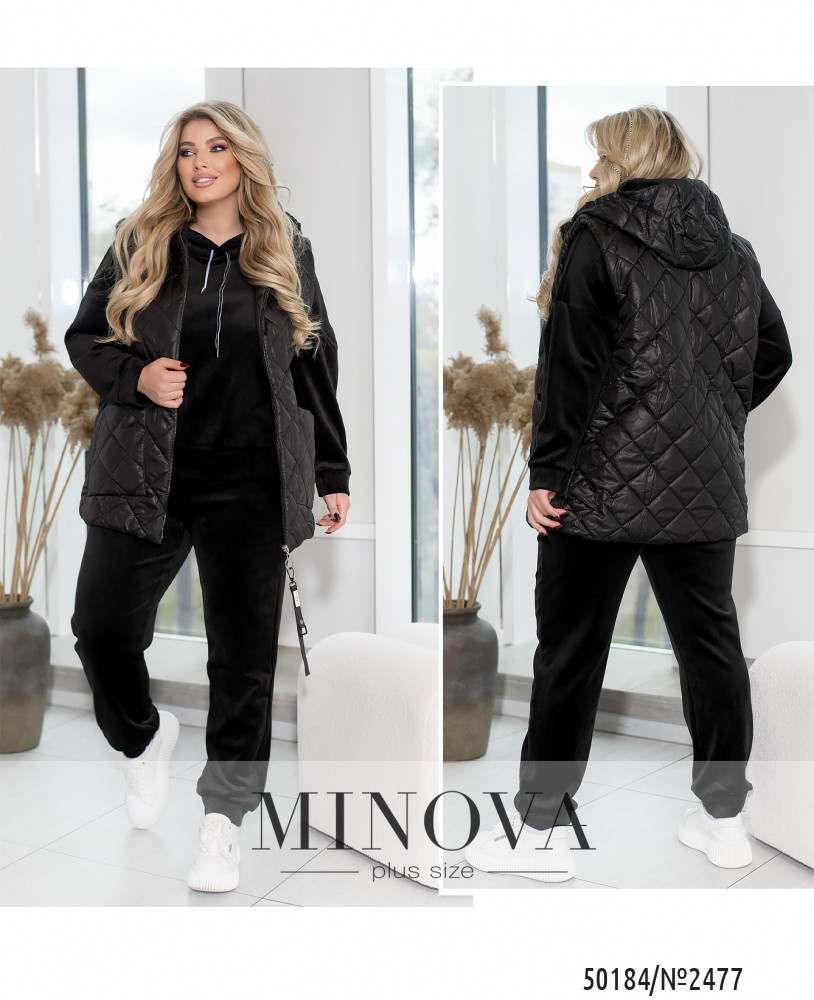 Зустрічайте наш універсальний костюм трійка, створений для стильних і зручних образів у прохолодну погоду. Комплект складається з жилетки з капюшоном та накладними кишенями, кофти зі спущеними рукавами та капюшоном зі шнурком, а також прямих штанів з середньою посадкою і кишенями по боках.Жилетка додає практичності та стилю завдяки капюшону і накладним кишеням. Кофта з капюшоном і спущеними рукавами створює невимушений і затишний образ. Прямі штани з середньою посадкою забезпечують комфорт і стиль. Вони практичні завдяки кишеням по боках і низу на резинці. Цей костюм — вибір активних жінок, які цінують якість і стиль.Ідеальний варіант, для жінок, які поспішають та полюбляють бути в комфорті. Доповніть образ кросівками чи об'ємними чоботями
