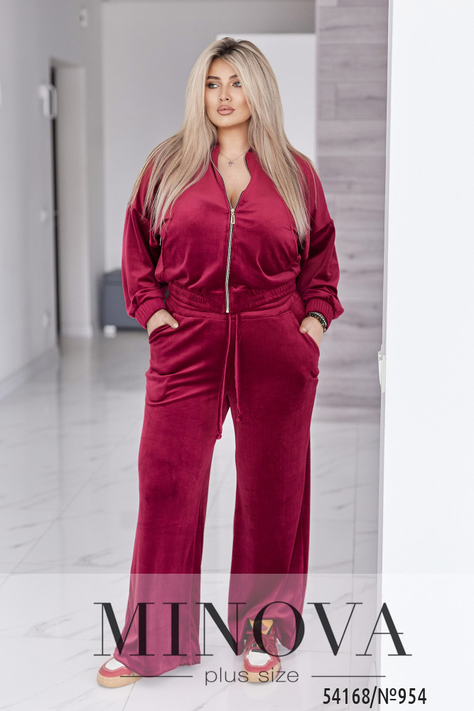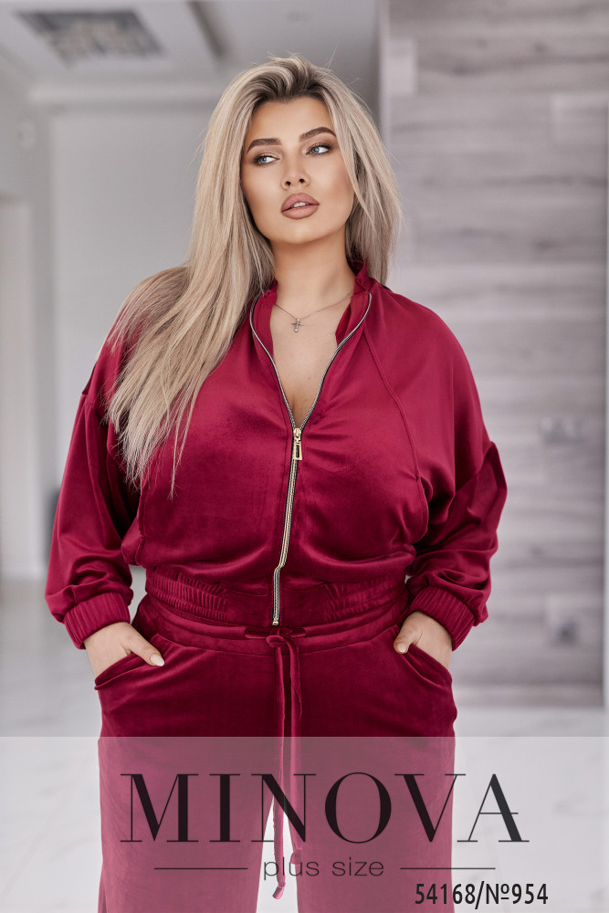 Велюровий оксамитовий костюм складається з кофти і штанів. Кофта вільного крою oversize, з застібкою блискавкою і коміром стійкою. В рельєфних швах спереду є кишені. Рукав зі спущеною лінією плеча, манжети на рукавах та низ кофти на еластичній широкій резинці. Штани - висока комфортна посадка. Пояс на широкій резинці + декоративний шнурок.Прямий вільний крій, з кишенями. Глибокі трендові відтінки та оксамитова текстура створюють образ, який виглядає дорого без зайвих деталей. Лаконічний крій, м’які лінії та ідеальна посадка підкреслюють жіночність і впевненість.